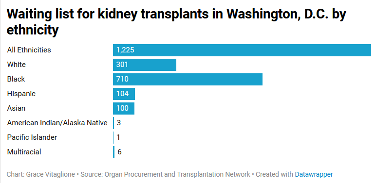 Matthew Cooper, kidney and pancreas transplant program director at Medstar Georgetown Transplant Institute, said although roughly 60% of the people waiting for a kidney are African American, 60% of the living donor transplants are from Caucasians.